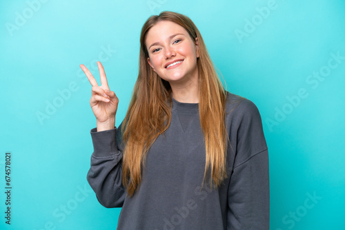 Young caucasian woman isolated on blue background smiling and showing victory sign