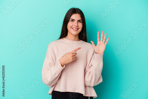 Young caucasian woman isolated on blue background smiling cheerful showing number five with fingers.