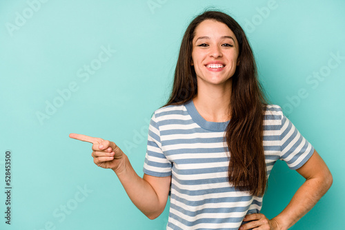 Young caucasian woman isolated on blue background smiling cheerfully pointing with forefinger away.