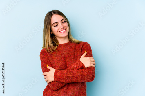 Young caucasian woman isolated on blue background smiling confident with crossed arms.