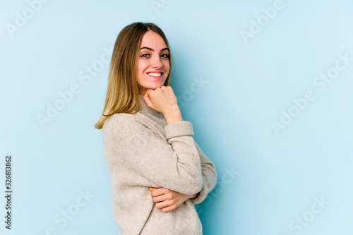 Young caucasian woman isolated on blue background smiling happy and confident, touching chin with hand.
