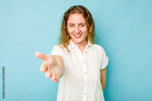 Young caucasian woman isolated on blue background stretching hand at camera in greeting gesture.