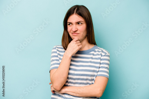 Young caucasian woman isolated on blue background suffers pain in throat due a virus or infection.