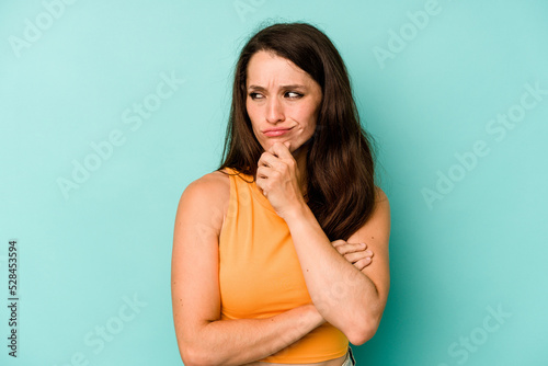 Young caucasian woman isolated on blue background suffers pain in throat due a virus or infection.