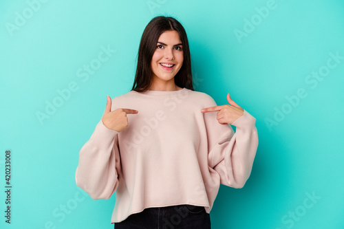 Young caucasian woman isolated on blue background surprised pointing with finger, smiling broadly.