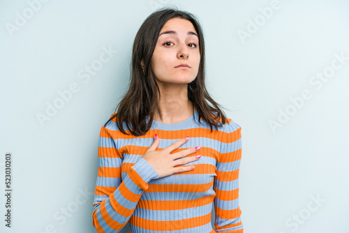 Young caucasian woman isolated on blue background taking an oath, putting hand on chest.
