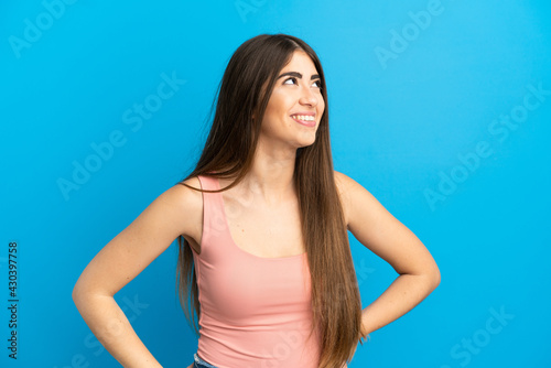 Young caucasian woman isolated on blue background thinking an idea while looking up