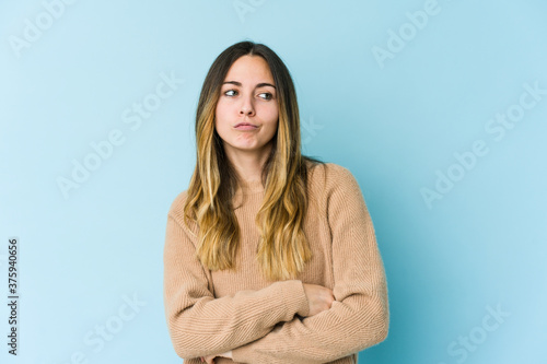 Young caucasian woman isolated on blue background tired of a repetitive task.