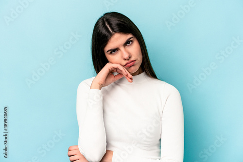 Young caucasian woman isolated on blue background tired of a repetitive task.