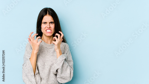 Young caucasian woman isolated on blue background upset screaming with tense hands.