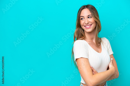 Young caucasian woman isolated on blue background with arms crossed and happy