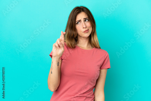 Young caucasian woman isolated on blue background with fingers crossing and wishing the best