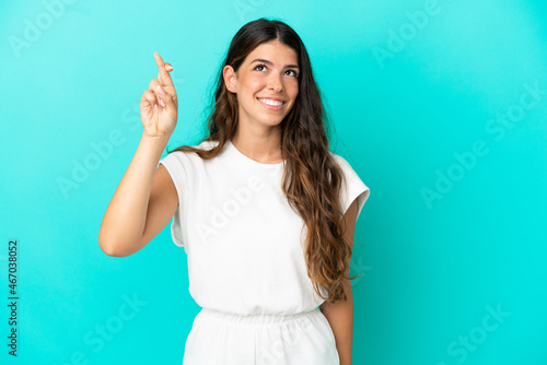Young caucasian woman isolated on blue background with fingers crossing and wishing the best