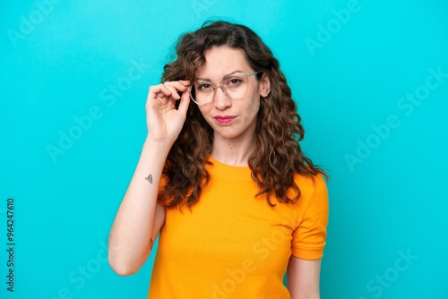 Young caucasian woman isolated on blue background With glasses and frustrated expression