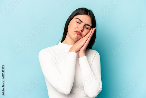 Young caucasian woman isolated on blue background yawning showing a tired gesture covering mouth with hand.