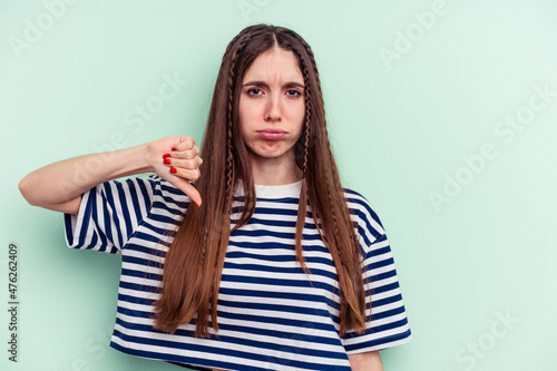 Young caucasian woman isolated on green background showing thumb down, disappointment concept.