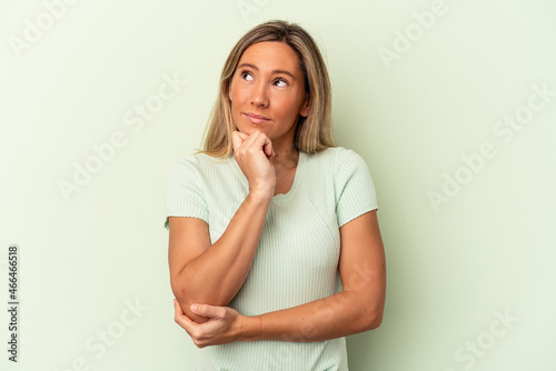 Young caucasian woman isolated on green background thinking and looking up, being reflective, contemplating, having a fantasy.