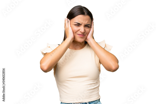 Young caucasian woman isolated on green chroma background frustrated and covering ears