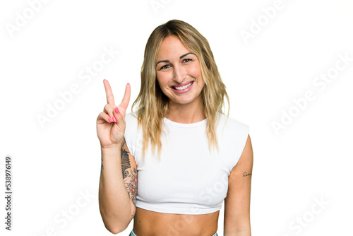 Young caucasian woman isolated on green chroma background joyful and carefree showing a peace symbol with fingers.