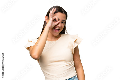 Young caucasian woman isolated on green chroma background showing ok sign with fingers