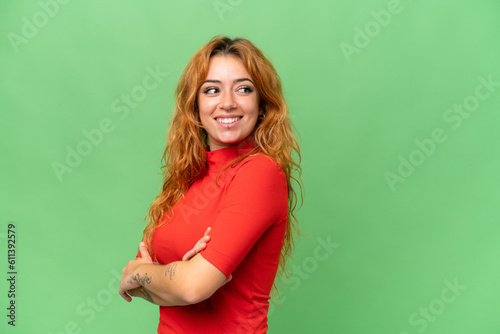 Young caucasian woman isolated on green screen chroma key background with arms crossed and happy