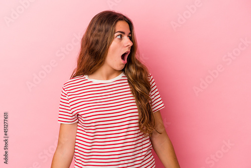 Young caucasian woman isolated on pink background being shocked because of something she has seen.