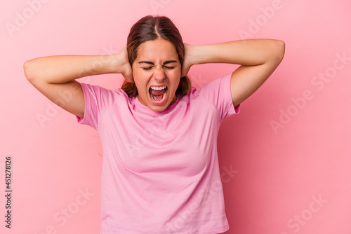 Young caucasian woman isolated on pink background covering ears with hands trying not to hear too loud sound.