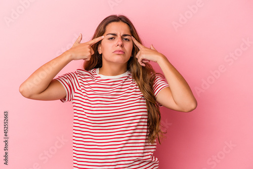 Young caucasian woman isolated on pink background focused on a task, keeping forefingers pointing head.