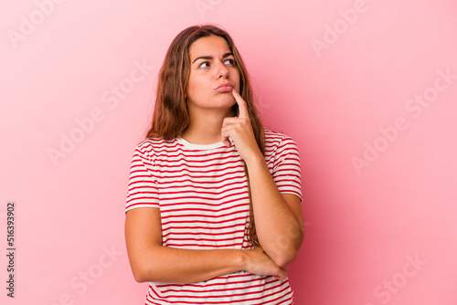Young caucasian woman isolated on pink background looking sideways with doubtful and skeptical expression.