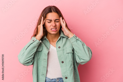 Young caucasian woman isolated on pink background touching temples and having headache.