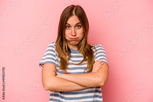 Young caucasian woman isolated on pink background blows cheeks, has tired expression. Facial expression concept.
