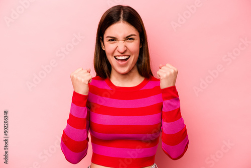 Young caucasian woman isolated on pink background cheering carefree and excited. Victory concept.