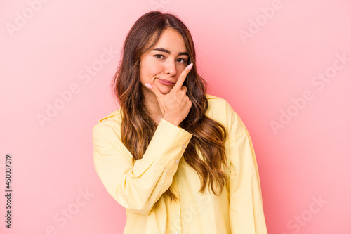 Young caucasian woman isolated on pink background contemplating, planning a strategy, thinking about the way of a business.