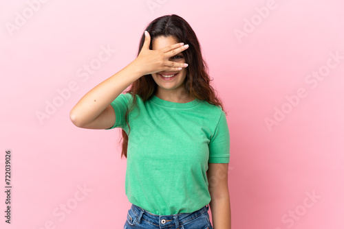 Young caucasian woman isolated on pink background covering eyes by hands and smiling