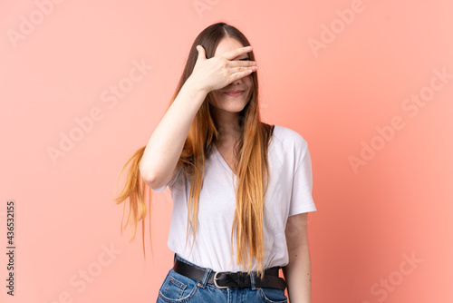 Young caucasian woman isolated on pink background covering eyes by hands. Do not want to see something