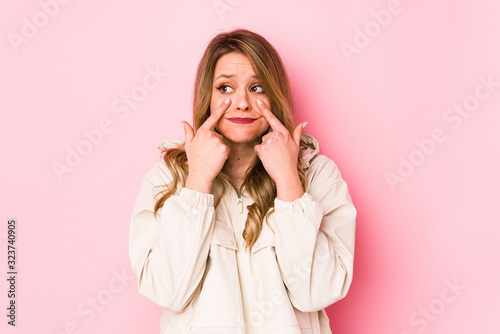 Young caucasian woman isolated on pink background crying, unhappy with something, agony and confusion concept.
