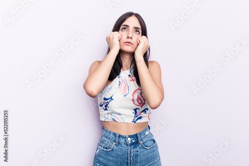 Young caucasian woman isolated on pink background crying, unhappy with something, agony and confusion concept.