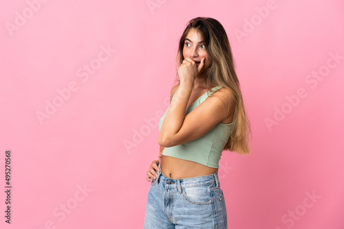 Young caucasian woman isolated on pink background doing surprise gesture while looking to the side