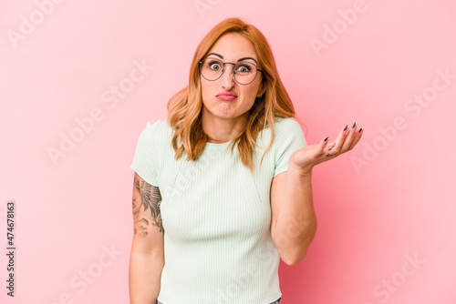 Young caucasian woman isolated on pink background doubting and shrugging shoulders in questioning gesture.