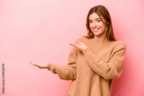 Young caucasian woman isolated on pink background excited holding a copy space on palm.