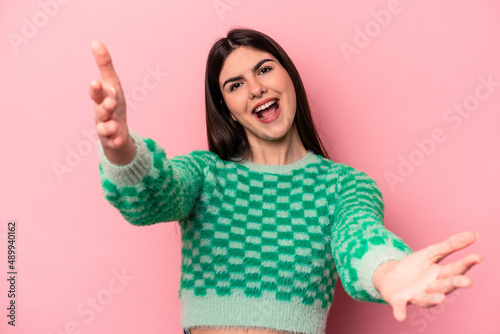 Young caucasian woman isolated on pink background feels confident giving a hug to the camera.