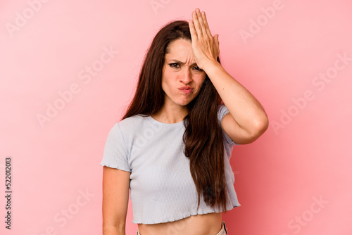 Young caucasian woman isolated on pink background forgetting something, slapping forehead with palm and closing eyes.