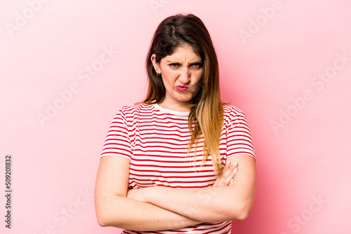 Young caucasian woman isolated on pink background frowning face in displeasure, keeps arms folded.