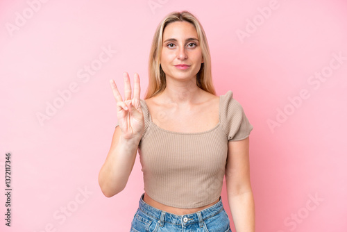 Young caucasian woman isolated on pink background happy and counting three with fingers