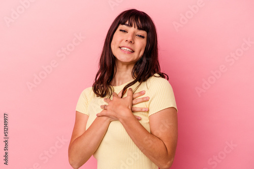 Young caucasian woman isolated on pink background has friendly expression, pressing palm to chest. Love concept.