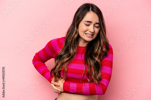 Young caucasian woman isolated on pink background having a liver pain, stomach ache.