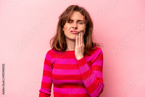 Young caucasian woman isolated on pink background having a strong teeth pain, molar ache.