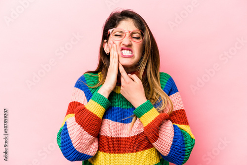 Young caucasian woman isolated on pink background having a strong teeth pain, molar ache.