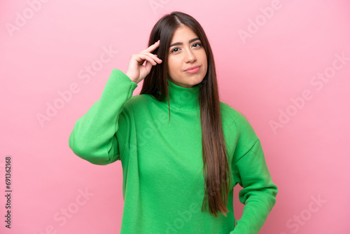 Young caucasian woman isolated on pink background having doubts