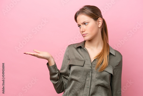Young caucasian woman isolated on pink background holding copyspace with doubts